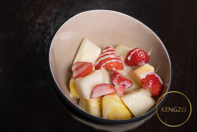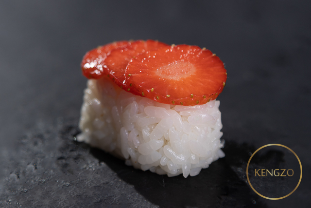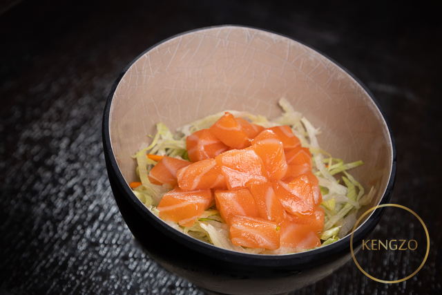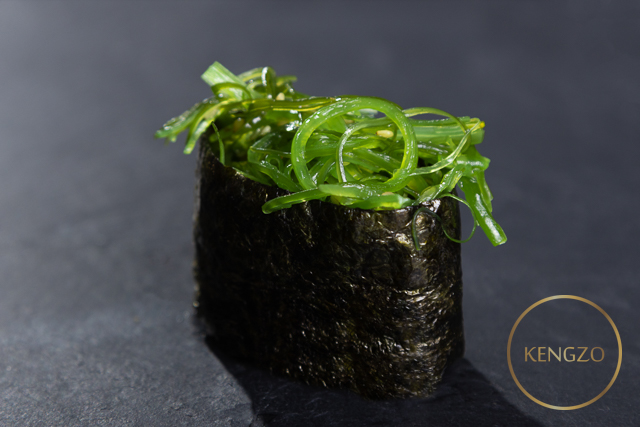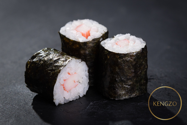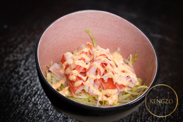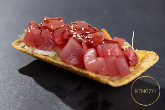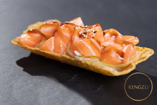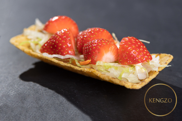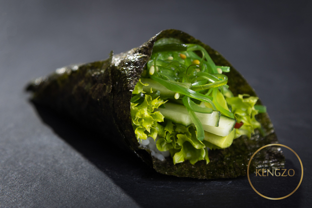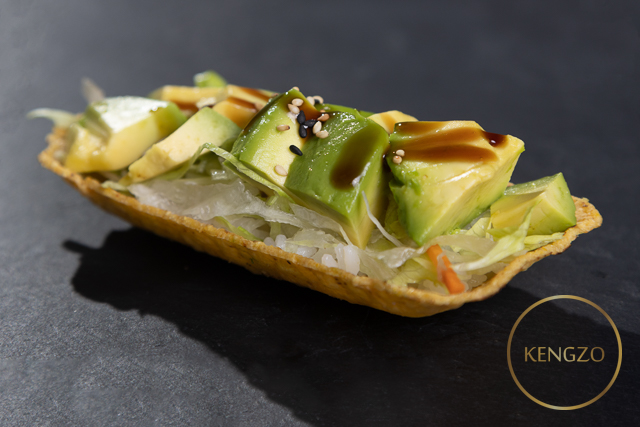 Garnaalrol met avocado, met duo van dressings en pittige wasabi crunch