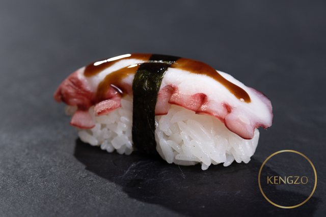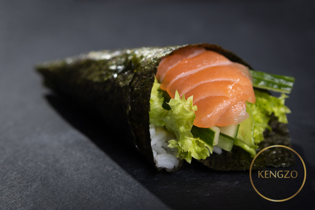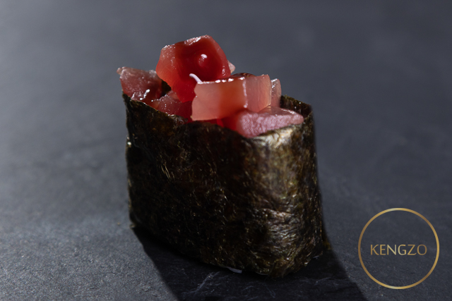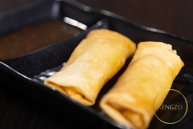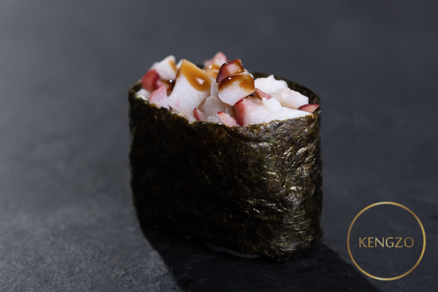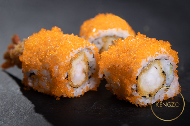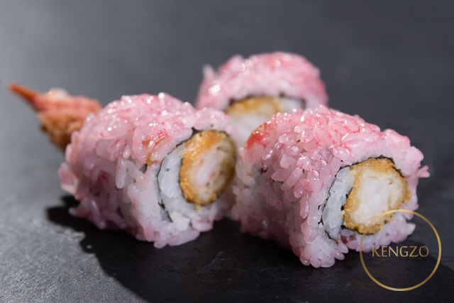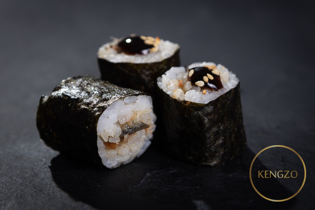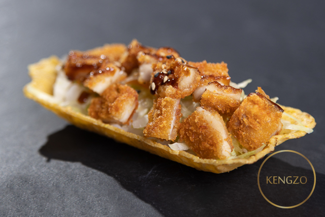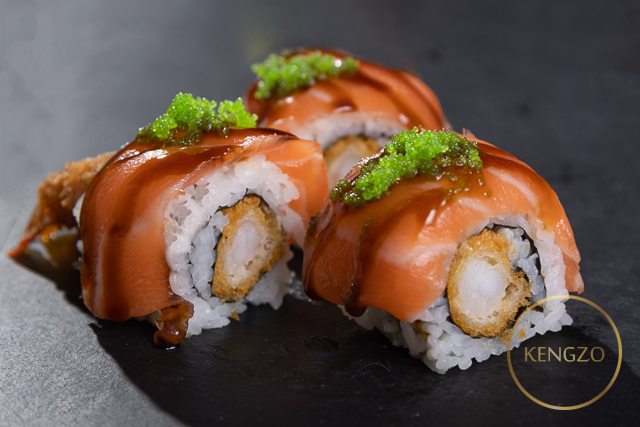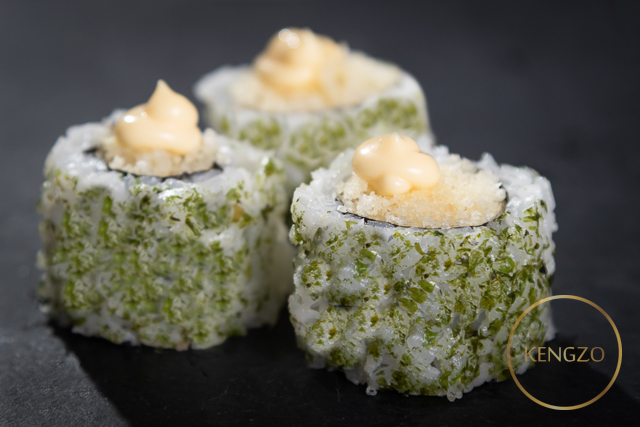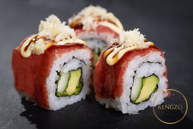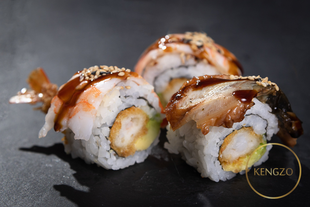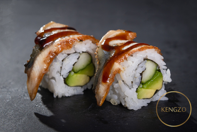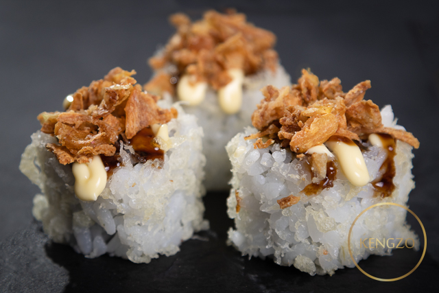 Rol met crispy kip en avocado, afgewerkt met een pittige saus en zoete unagi dressing