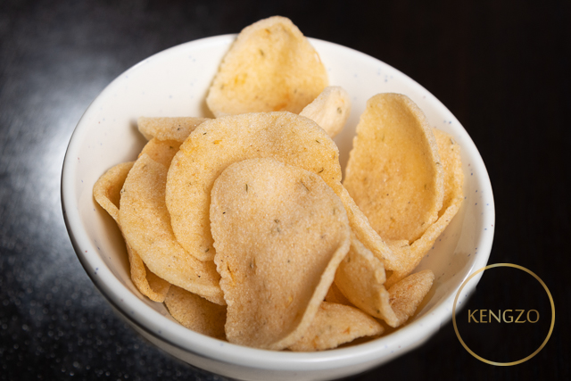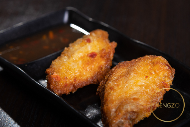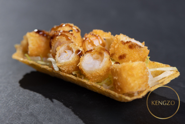 Krokant gefrituurde tempura garnalen, geserveerd met een gember-sojadip