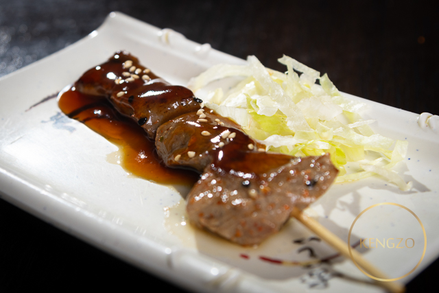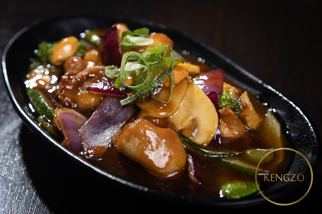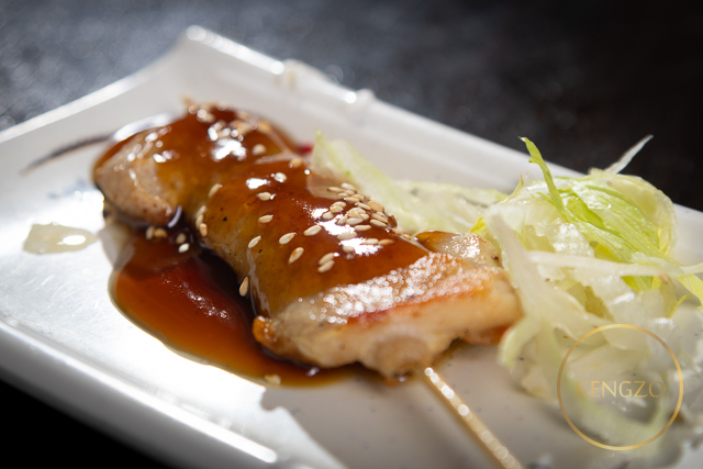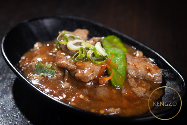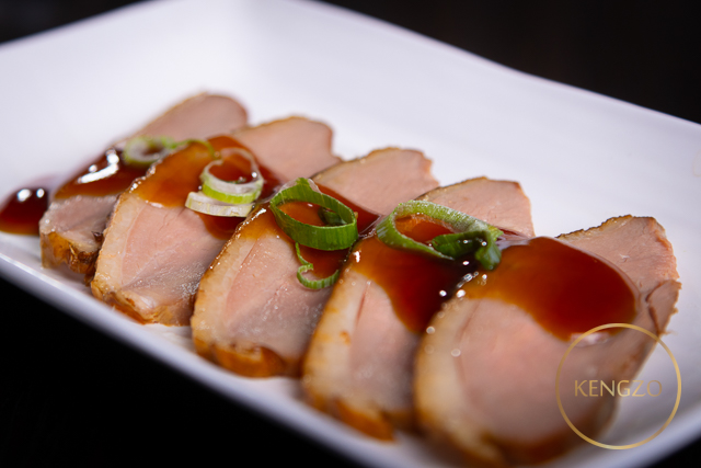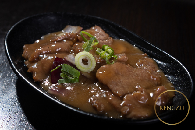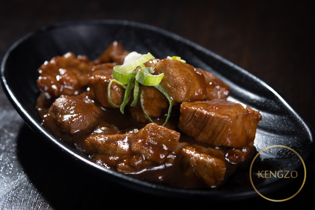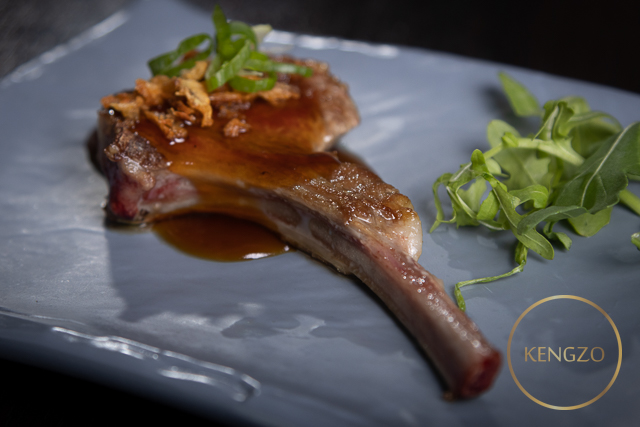 Lamsrack in zoete teriyakisaus, afgewerkt met gebakken ui en bosui