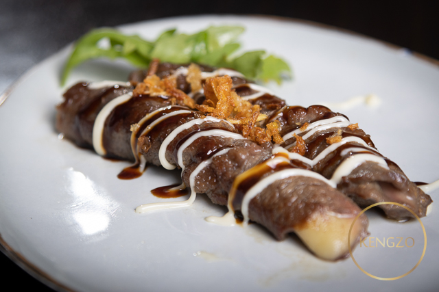 Dun gesneden ribeye, opgerold en gevuld met gesmolten kaas